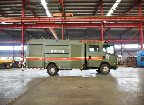 電氣配置 | 駕駛室頂部前端為長排**燈,車身后配有24V60W火場照明燈一只,車輛兩側上方各配有紅藍相配的爆閃燈,下方安裝安全標志燈,乘員室、器材箱、泵房內均裝有照明燈,加裝有100W**報燈,加轉**燈開關,通訊設備預留接口。 | ||