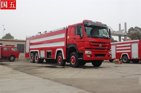 重汽豪沃23噸泡沫消防車,在豪沃底盤上改裝而成,配備常用消防器材,載液量水20m3+泡沫3m3,具有機動性好、操作方便、射程遠的特點,適用于消防隊、專職隊、大型企業、港口、碼頭、工業園、風景區等場所。